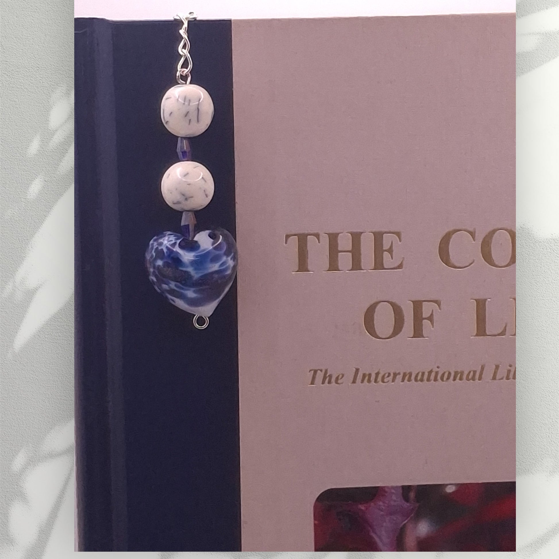 Sophisticated silver-tone flat feather bookmark with faux porcelain beads, blue glass spacers and blue willow heart charm.
