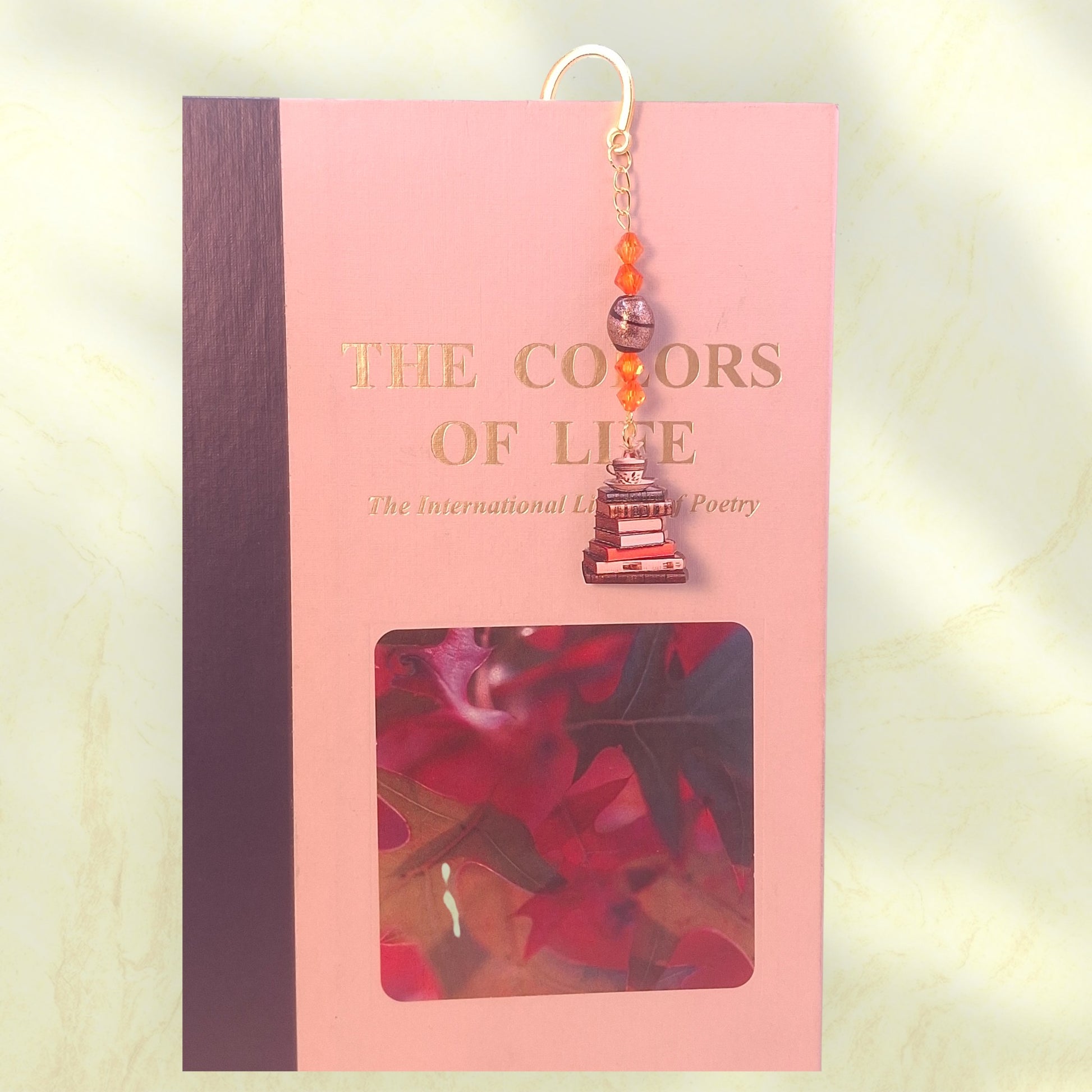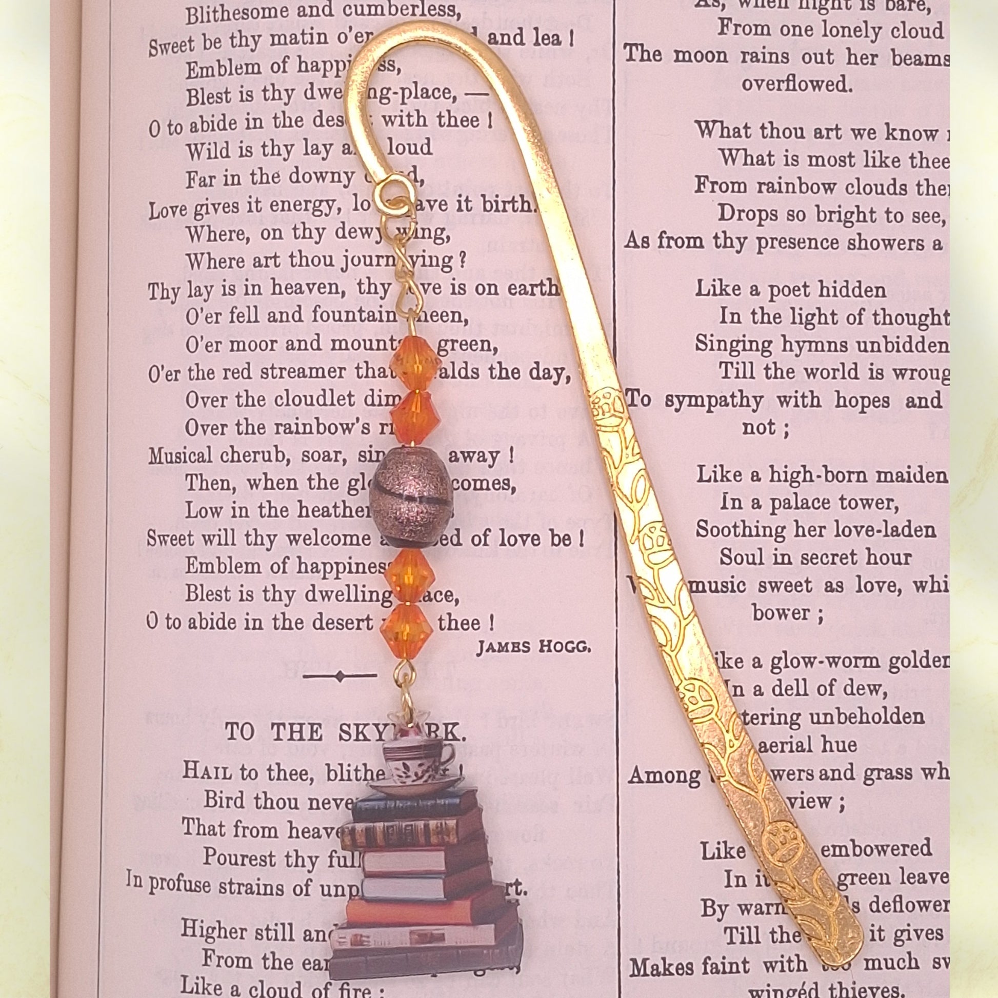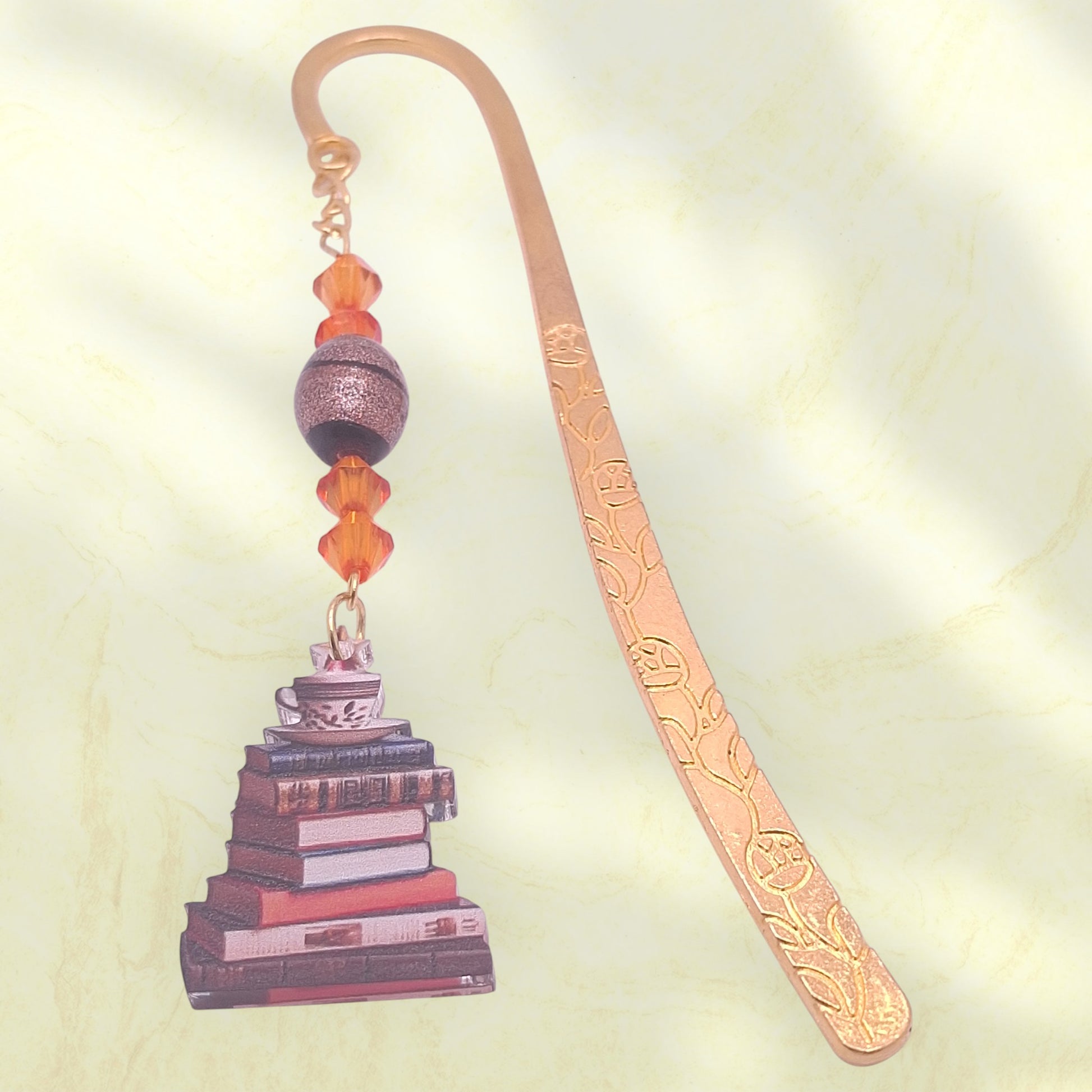 Gold-tone floral etched bookmark with orange beads, accent brown bead with shimmer line, and bookmark charm. Essential bookmark for a bibliophile.