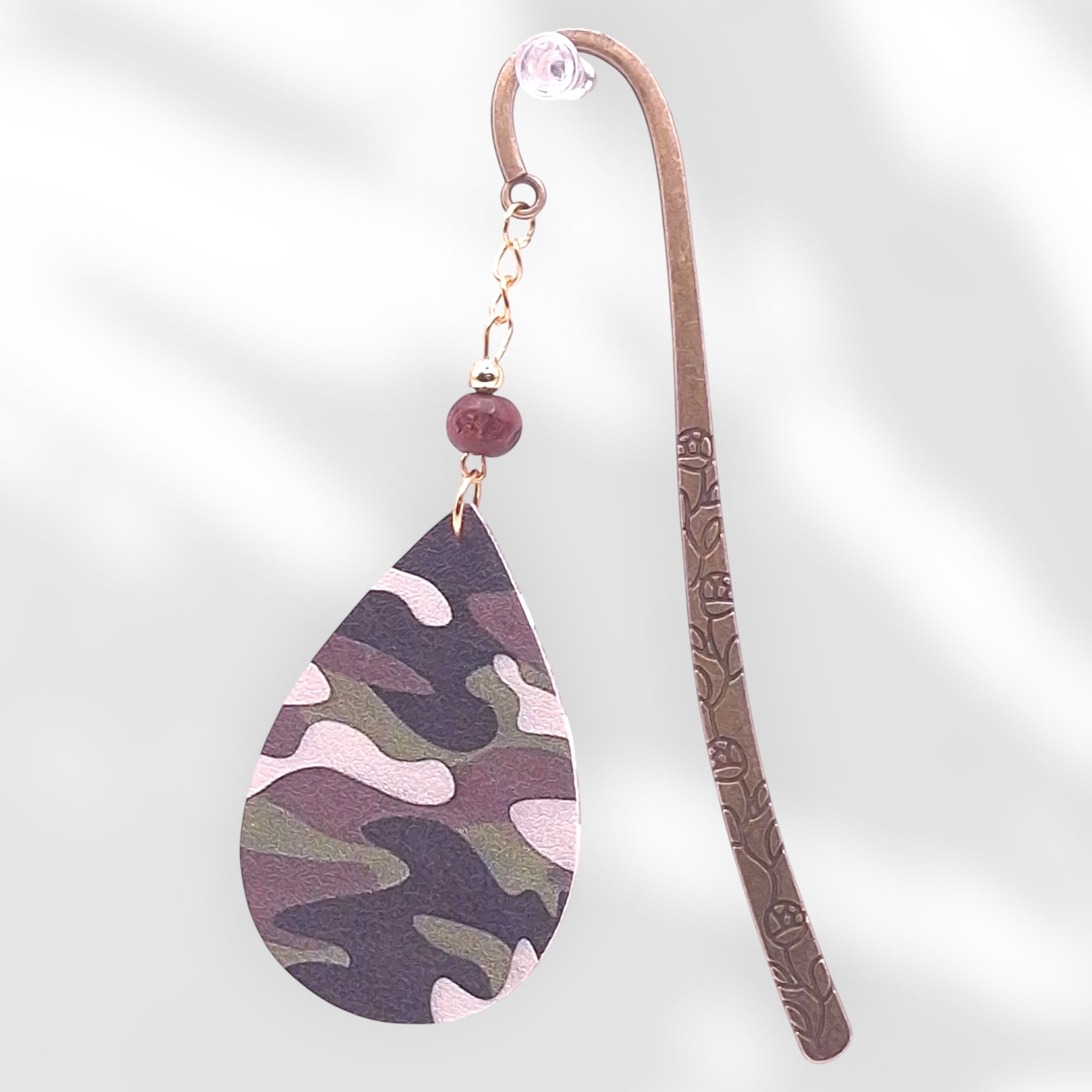 Brass-tone floral etch bookmark, brown bead, featuring a faux leather camouflage teardrop. Great gift for readers - men and women.