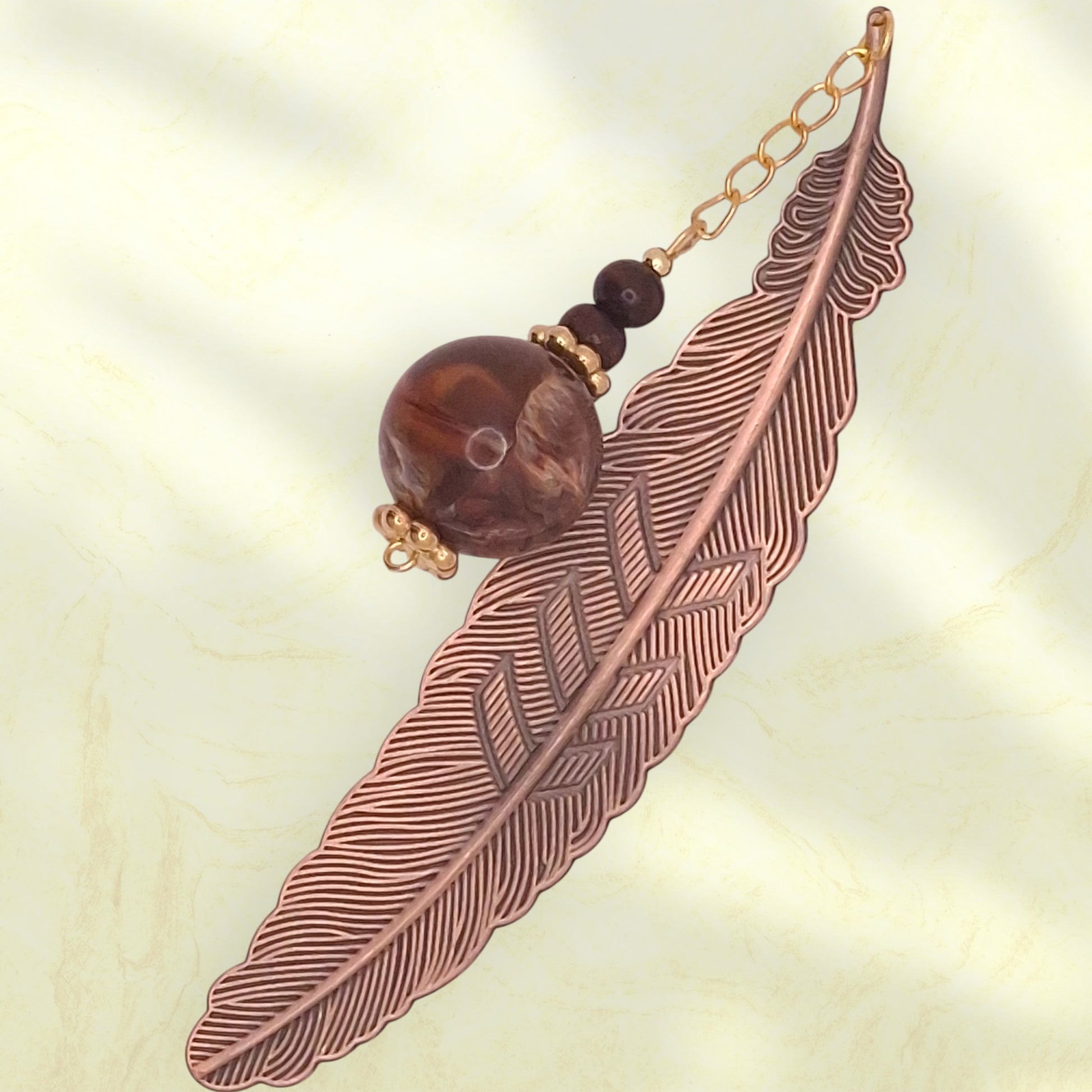 Copper-tone flat feather bookmark, brown beads, spacers, and luxurious coffee ball with cream swirls. Delicious bookmark for book and coffee lovers.