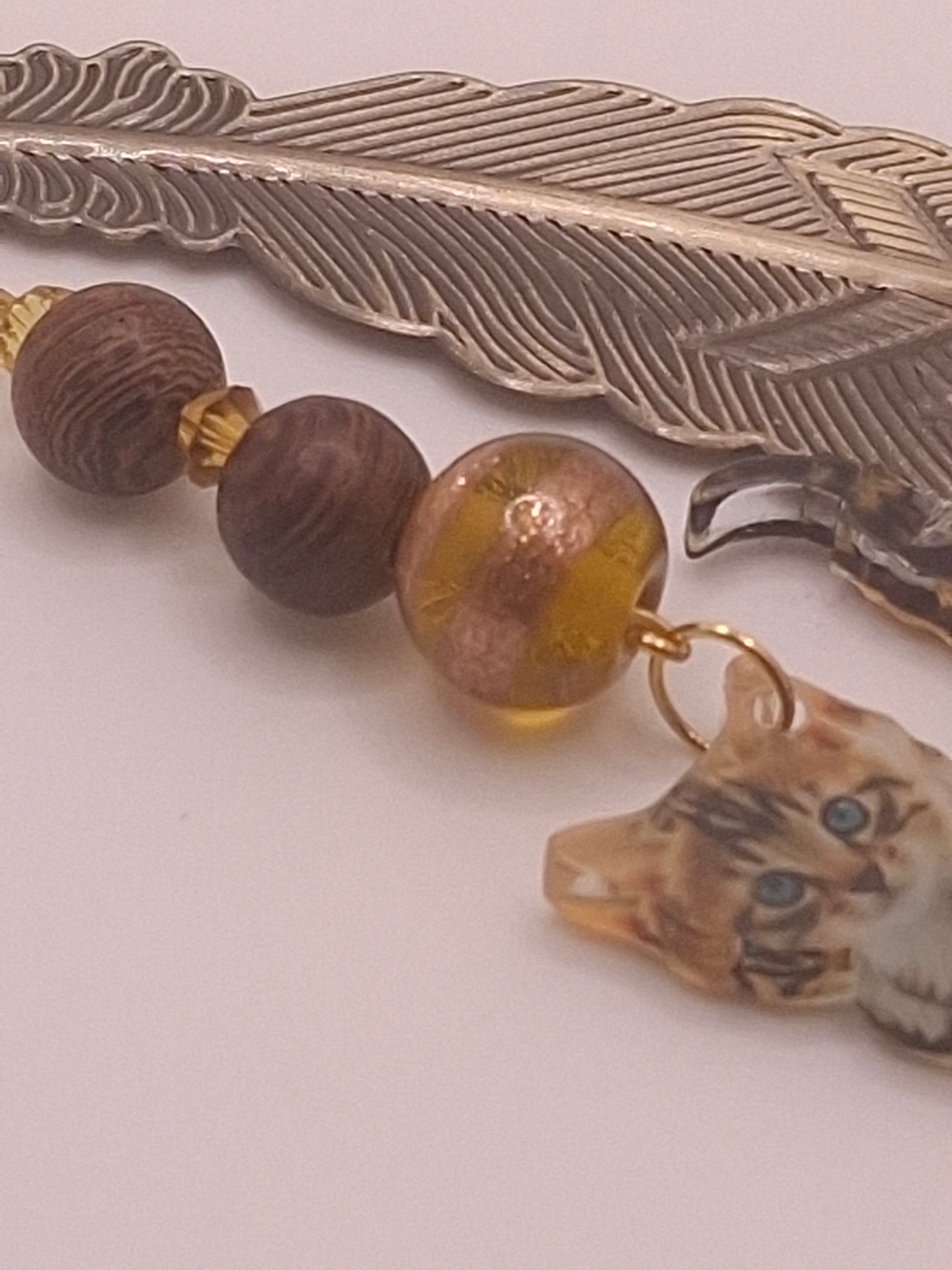 Decorative flat feather brass-tone bookmark with topaz color bead and wooden beads, and tabby kitten charm. Great combination for book and cat lovers.